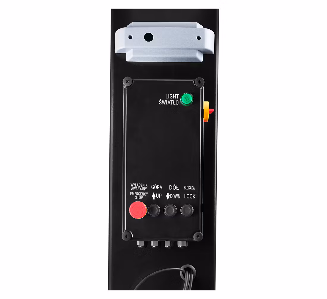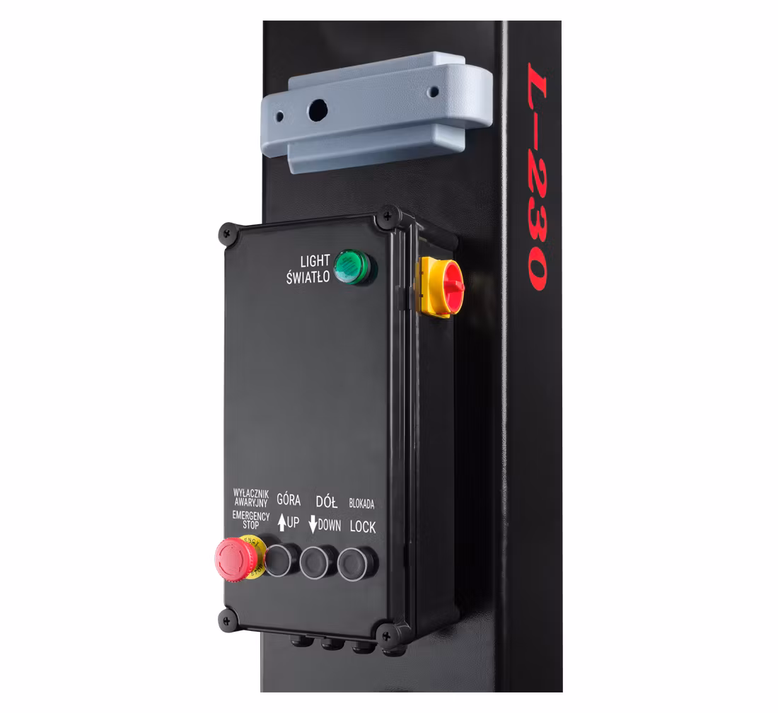 L-230 är helautomatisk och utrustad med elektromagnetiska säkerhetslås. När du trycker på sänkknappen frigörs spärrarna automatiskt – du slipper gå mellan pelarna för manuell upplåsning.