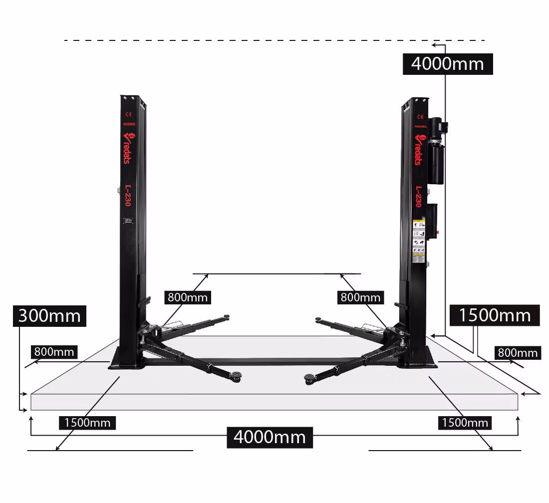 REDATS L-230 är en kraftfull och användarvänlig automatisk tvåpelarlyft med 4 tons kapacitet, framtagen för verkstäder som arbetar med allt från personbilar till lätta skåpbilar. Den kombinerar hög arbetskomfort, smidig hantering och robust konstruktion i ett driftsäkert paket – även för dig som ofta lyfter längre fordon.