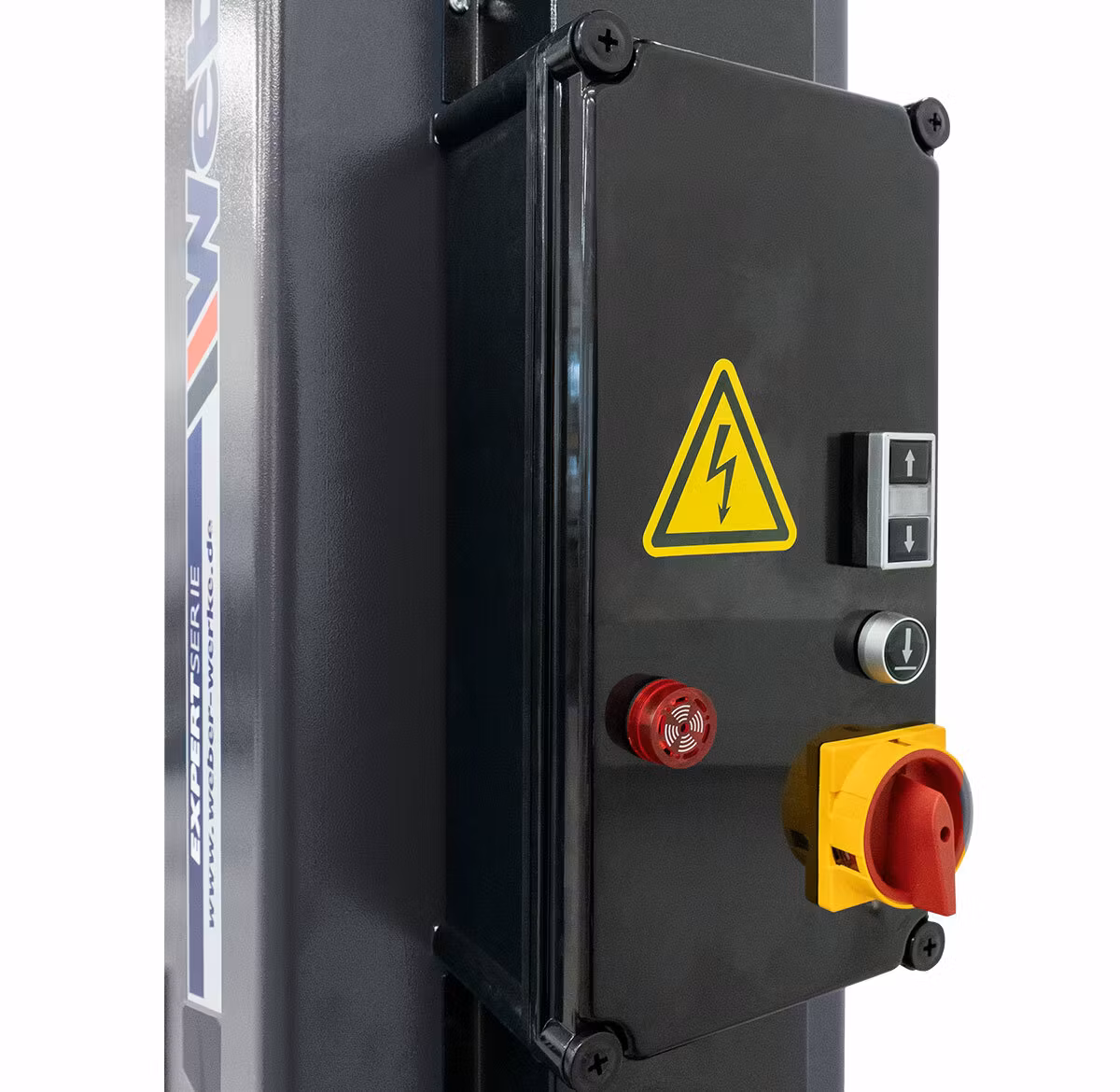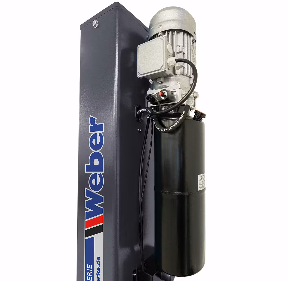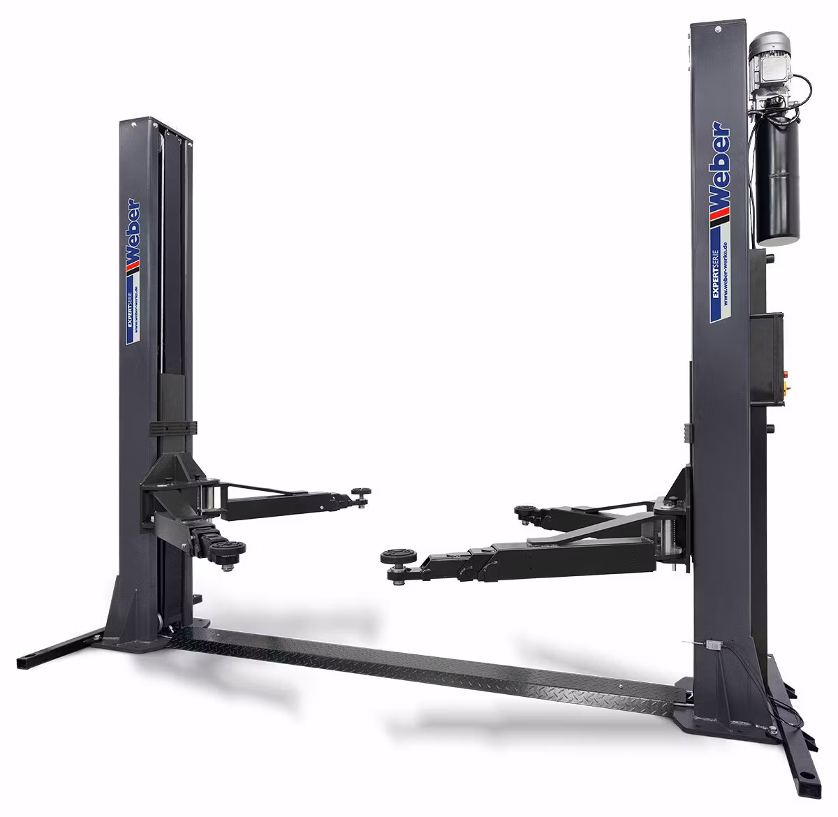 Elektrohydraulisk 2-pelarslyft med 6000 kg lyftkapacitet, massiv lyftpelarstabilisering, dubbla teleskopiska lyftarmar, automatisk frigöring av säkerhetsspärrar och 400 V elanslutning.