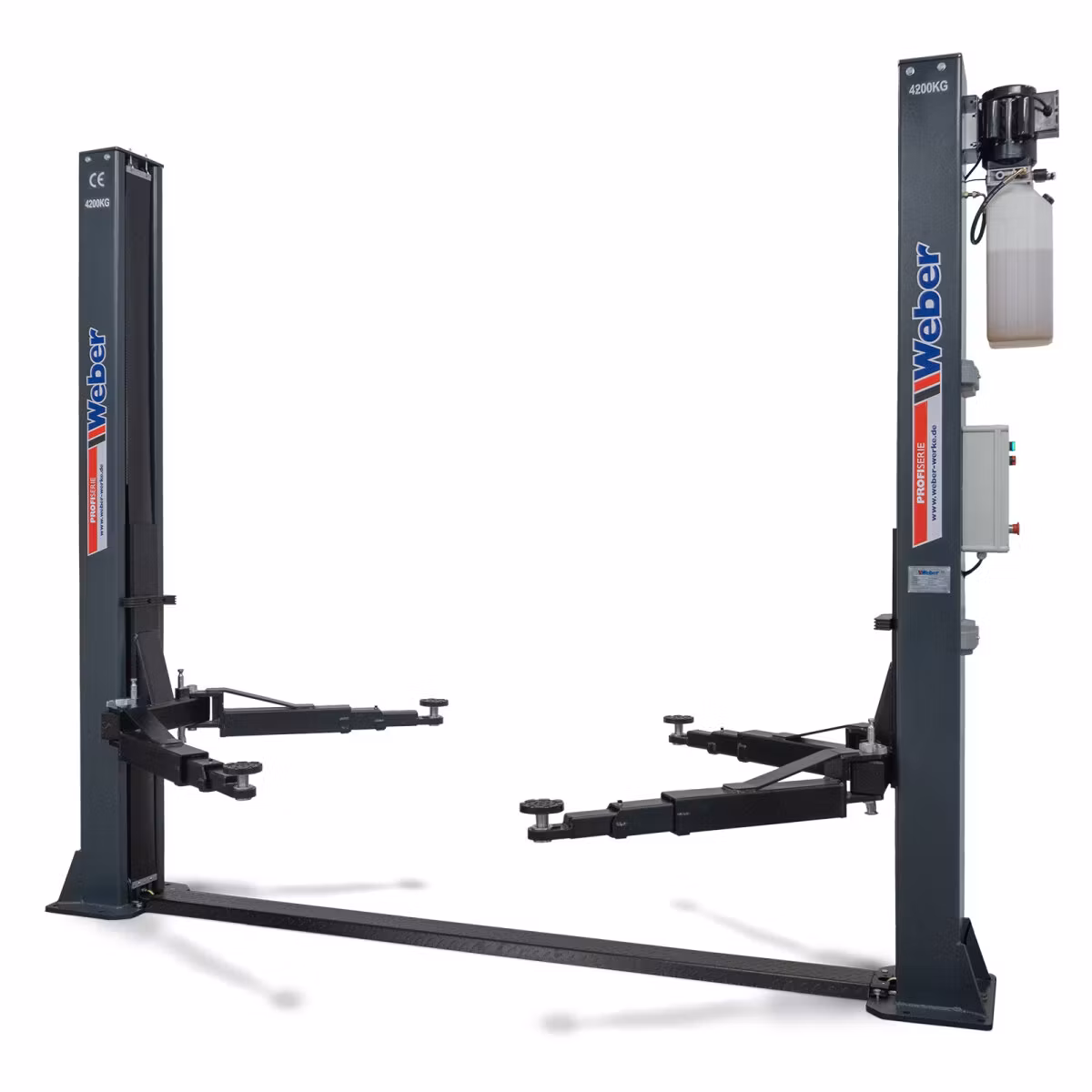 Elektrohydraulisk 2-pelarslyft med en lyftkapacitet på 4200 kg, överkörningsskydd, asymmetriska lyftarmar, automatisk upplåsning av säkerhetsspärrarna och en 230 V elanslutning. Lyften är delvis förmonterad, vilket möjliggör snabb idrifttagning.